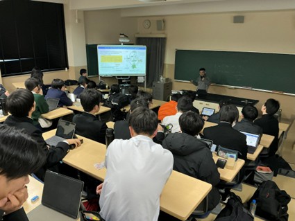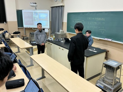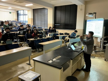 ANDRIANTOさんの研究テーマは「タイリクヒメハナカメムシにおける高温耐性と共生微生物の関係」で、将来農薬に頼らない農業を目指すために研究されています。内容は難解であったものの、田崎さんが難しい単語や内容の説明を適宜日本語で伝えてくださったおかげで、生徒は理解しながら楽しく講義を受けていました。