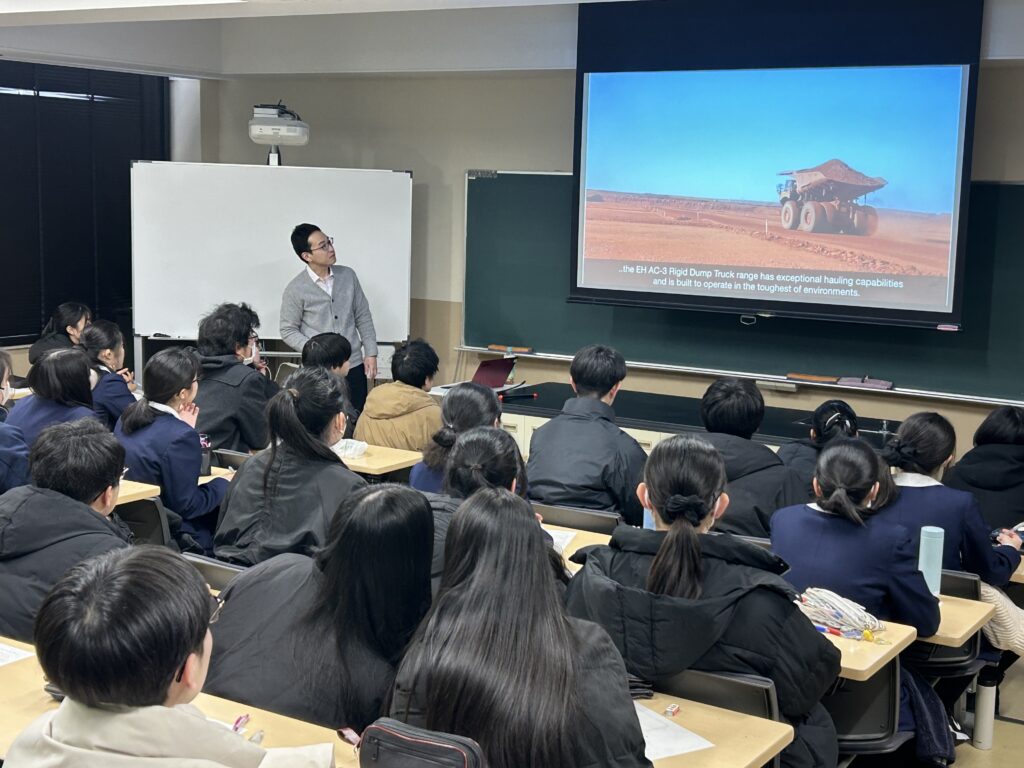 社会課題を「技術」で解決された実績を、オーストラリア鉱山での自立走行ダンプトラックの開発と、物流走行での自動化技術の開発のプロセスを通じて、話されました。生徒にとってイメージしやすい内容で、技術開発の苦労とともにその遣り甲斐や楽しさが生徒に伝わっていました。また、オーストラリアで現地スタッフとともにチームで取り組まれた経験から、どのように信頼関係を築いたのかについては大変参考になりました。将来、グローバルに活躍することを希望する生徒たちにとって、学びの機会を得ました。