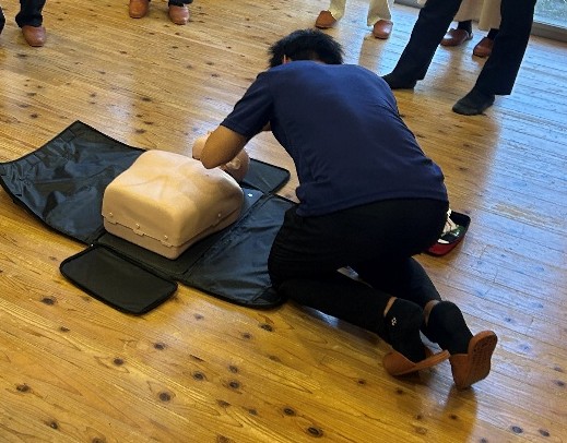 10月17日に、日本赤十字社滋賀県支部講習指導員の方を講師にお招きし、教職員救急法講習会を行いました。一次救命処置(心肺蘇生やAED)の実習や、車椅子や担架での搬送について学び、手技やいざという時のチームでの動き方について再確認できる機会となりました。
